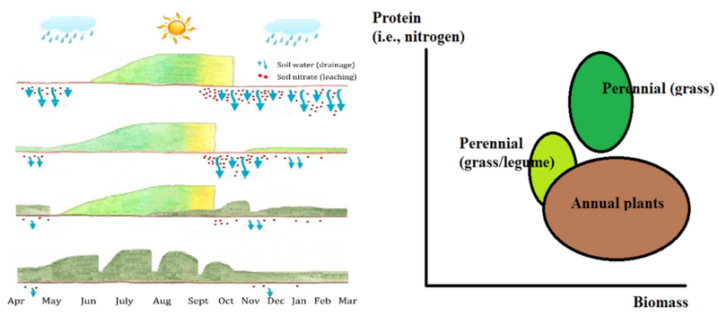 Effect of crop season on nitrogen leaching and of biomass-protein link related to plant life duration (from Manevski et al., 2018 and Solati et al., 2018).