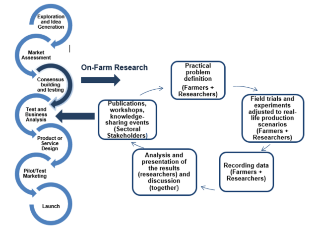 As the Lab started to develop products, the on-farm method merged with the classical product development stages, thus creating its specific ÖMKi Lab product development process. In this process, the on-farm research is used to define and/or test agricultural product ideas and services and adjust them to a market gap. New product/service testing, development and improvement can also take place as a service of the Living Lab.